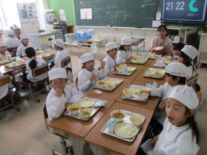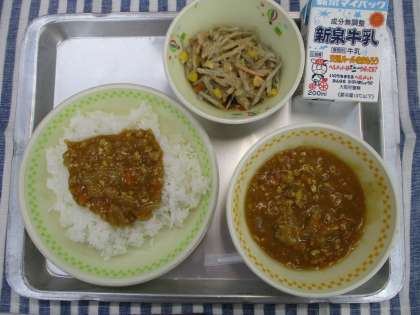 今日のカレーライスは、米粉でとろみをつけています。ふだんのカレーライスは、小麦粉から作られる「ルウ」でとろみをつけています。最近は、「小麦粉」の代わりに「米粉」を使った商品がたくさん出てきました。小麦は輸入が多いですが、 米は国内でたくさん作られています。米粉を使うことは、自給率アップにつながり、小麦アレルギーの人も食べられるので、とてもいいですね。