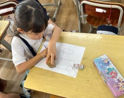 算数では、かたちあそびの学習に取り組んでいます。今日はもってきた箱をうつしとり、絵を描きました。「いぬができた!」「ロボットができた!」と嬉しそうです。