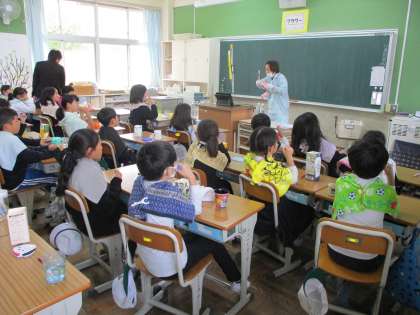 実習の際、島根県吉賀町立蔵木小学校が作成したオリジナル歯みがき動画「しゃかしゃかしゅわしゅわ〜蔵木小学校はみがきソング」を使用しました。ご家庭でもご使用できるようリンク一覧に「学校歯科医おすすめハミガキ動画」があります。