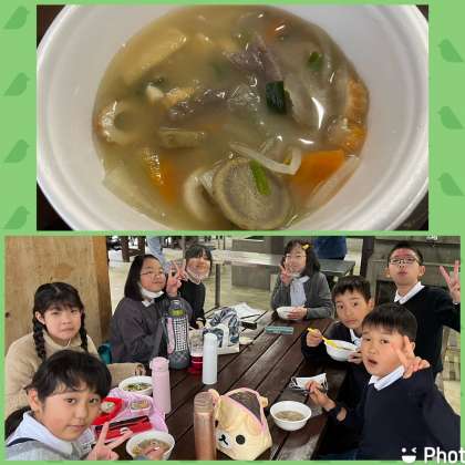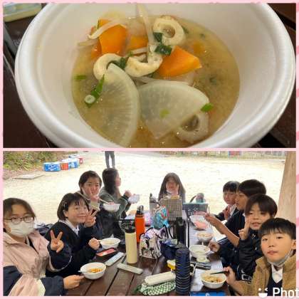 自分たちで協力して作ったみそ汁のおいしさに、笑顔いっぱいで食べていました。