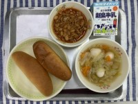 今日の給食は ミニパン・揚げパン うずら卵の野菜スープ チリコンカン 牛乳 で...