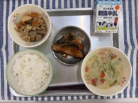 今日の給食は ごはん 味噌汁 いも煮 鰺のみりん干し 牛乳 です。