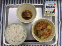 今日の給食は ごはん 寄せ鍋風 サバの味噌煮 牛乳 です。