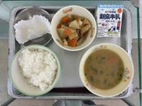 今日の給食はごはん、さつま汁、肉大根、ういろう、牛乳です。