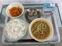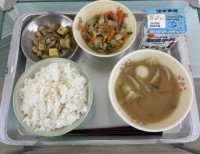 今日の給食はごはん、いなか団子汁、はくさいとしろ菜の煮びたし、豆かりんとう、牛乳...