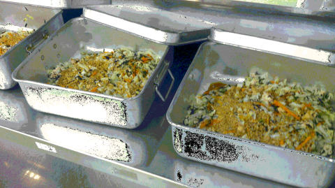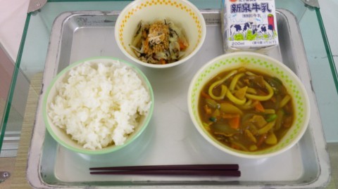 今日の給食はごはん、カレーうどん、和風サラダ、牛乳です。