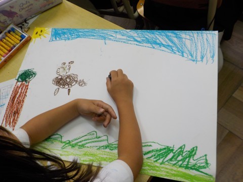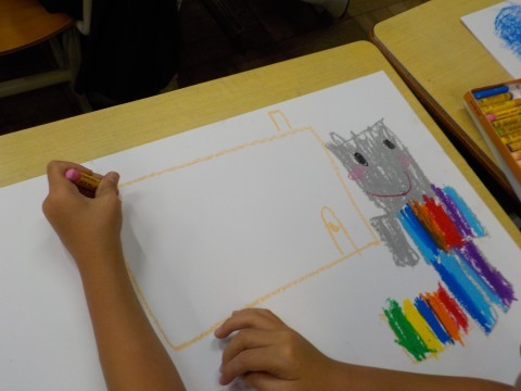 2組は図工で「できたらいいな」をテーマに絵を描いていました。「おかしの家に住めたらいいな」「くじらの噴水に乗れたらいいな」などかわいい夢がたくさんでした(^^)