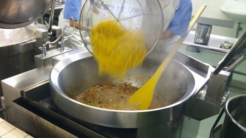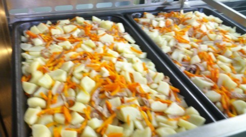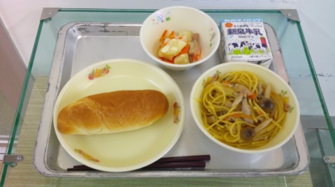 今日の給食はミニコッペパン、きのこスパゲティ、ポテトサラダ、牛乳です。