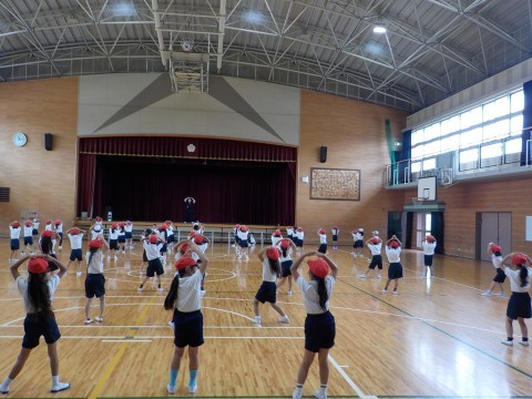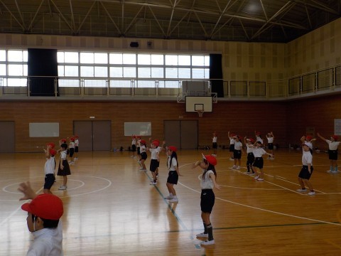 運動会の練習がはじまりました。先生の動きをよく見て,上手に体を動かすことができています。初めての小学校の運動会にむけて,がんばりましょう!