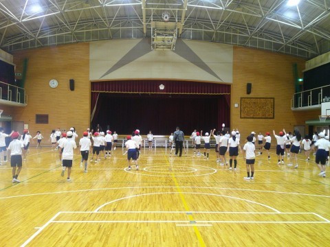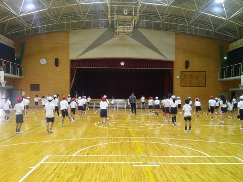 準備体操の「堺っ子体操」をしています。それぞれの動きを意識してしっかりと体を動かしていました。