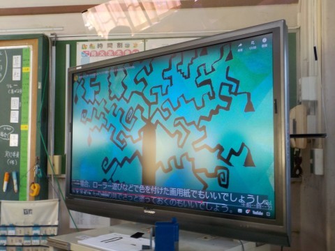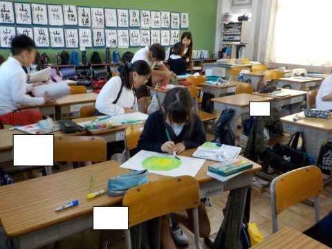 2組は図工で,自分の名前でデザインした絵や,木の絵を描いていました。