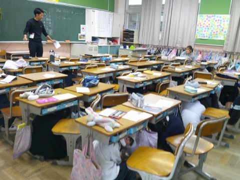 地震が起きたら,どのような行動をとるのかを学びました。地震発生のアナウンスがあるとすぐに自分の身を守る行動ができていました。地震が起きたら「落ちてこない」「倒れてこない」「移動してこない」場所に移動しておさまるまで自分の身を守る行動をしましょう。