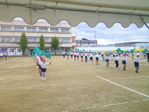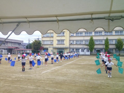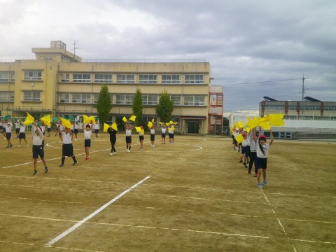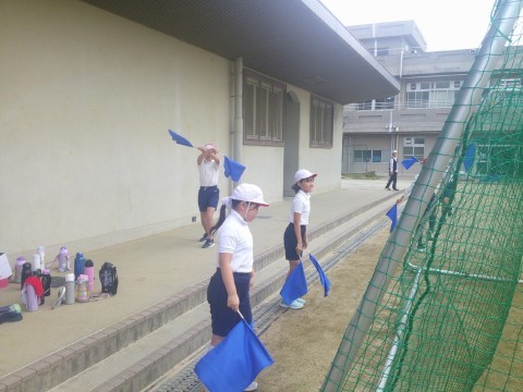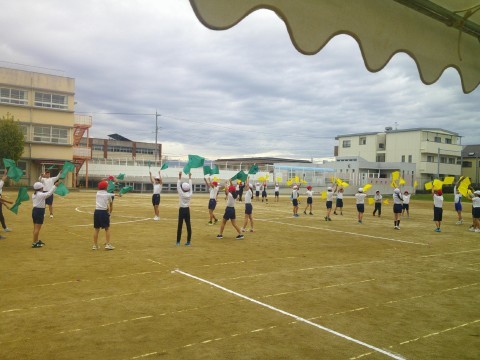 休み時間にもフラッグの動きのチェックをしていました。フラッグのダンス楽しいといってました。