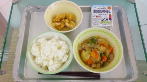 今日の給食はごはん、肉じゃが、チキン南蛮、牛乳です。
