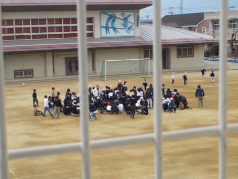 大きな揺れの想定で,子どもたちはそれぞれの場所で身を守る行動をとっていました。