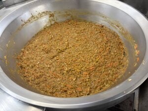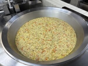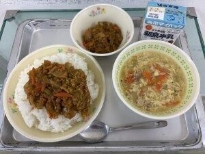 今日の給食はごはん、卵スープ、ドライカレー、牛乳です。