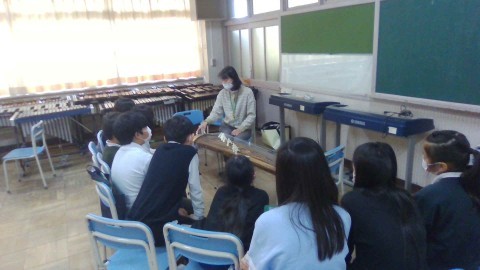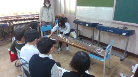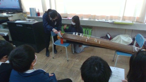 箏のみりょくを感じて学習しています。実際に箏の音色や響きを聴いて,実際に演奏しました。音の元となるのは,弦に振動をあたえることで発生する。なので止めると音がなくなるなど理科の学習とも関連付けながら,曲に合わせて弦の弾き方を工夫していました。