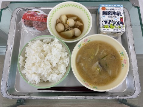 今日の給食はごはん、どんがら汁、鶏肉と里芋のさっぱり煮、フルーツゼリー(りんご)、牛乳です。