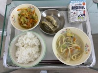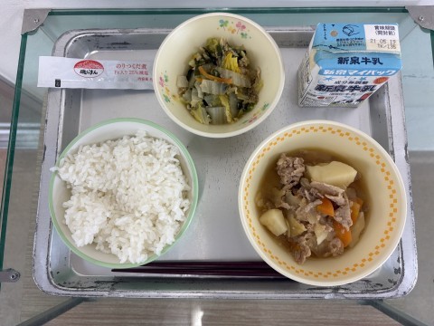 今日の献立はごはん、豚肉と野菜のしょうが煮、白菜とほうれん草のおひたし、のりの佃煮、牛乳です。