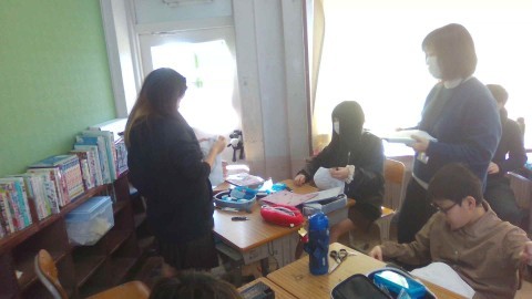 1~5年生にプレゼントする雑巾を模様や言葉をつけて縫っていました。思いのこもった雑巾を仕上げていました。