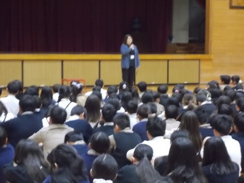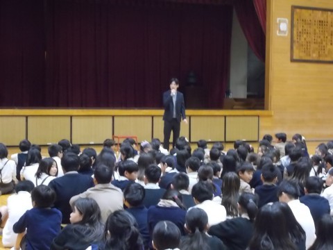 新しいクラスで体育館に集合して,赴任された先生のあいさつや校長先生,生徒指導の先生からのお話を聞きました。