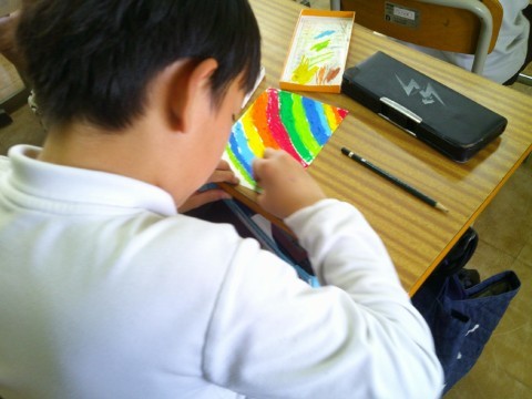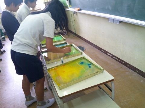 図工の時間では、マーブリングをしていました。好きな色を水に垂らしてかき混ぜて模様を作り