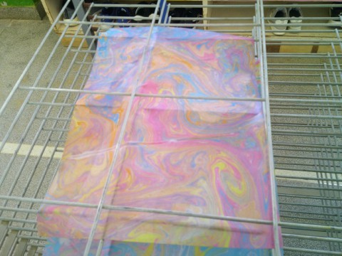 画用紙を水に浮かべてゆっくり持ち上げるとたくさんの色が混じった模様が出来上がりました。
