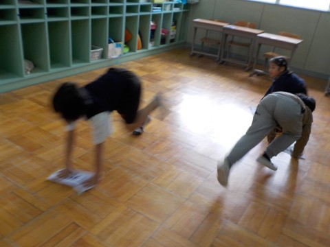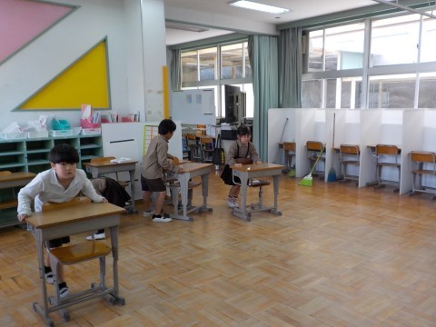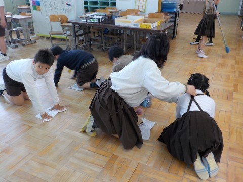 毎日掃除を頑張っています。高学年がやさしく掃除のやり方を教えています。