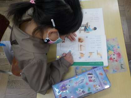 教科書のお手本を見ながら,えんぴつの持ち方を学びました。