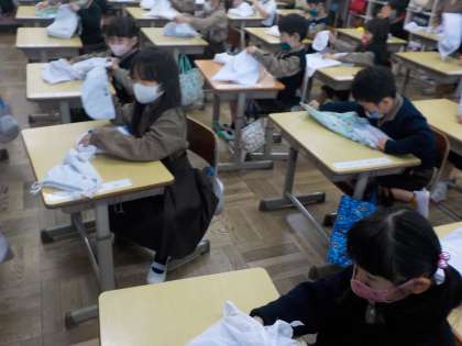 明日からの給食のためにエプロンをたたむ練習をしました。みんながんばって取り組めていました。