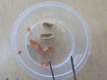 ヨウ素液を使って,種子に栄養があるか調べました。