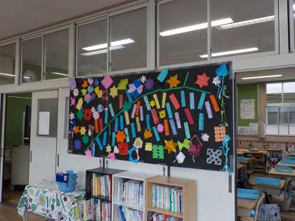 昨年度と教室の場所が変わっている学年があります。児童昇降口を入って正面の教室配置図をご確認ください。PTAさん企画の「やかみっこ七夕まつり」の作品も,学級前に掲示しています。
