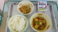 今日の給食はごはん、カレーうどん、和風サラダ、牛乳です。