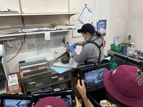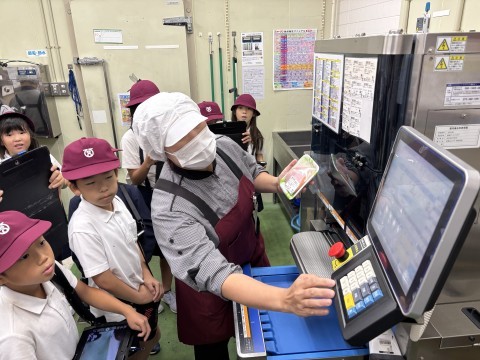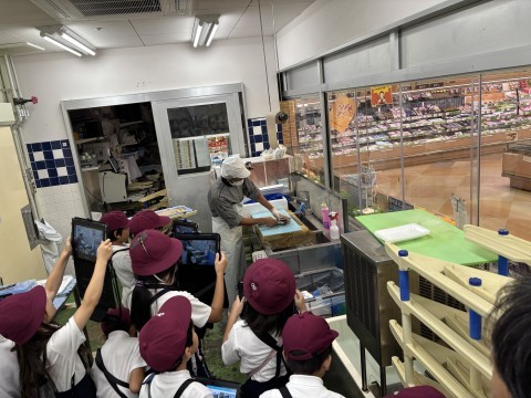 オークワ美原店へ見学に行きました。普段は見ることのできないスーパーの裏側を見せてもらい、肉を切っている様子、魚をさばいている様子、野菜を切っている様子など、食品が売り場に並ぶまでの工程を間近で見ることができました。
