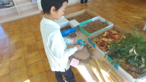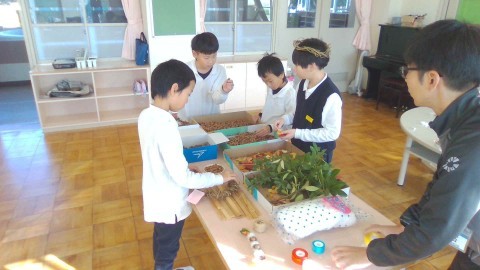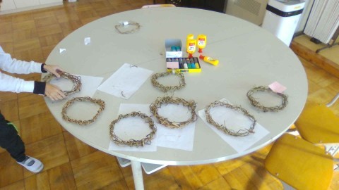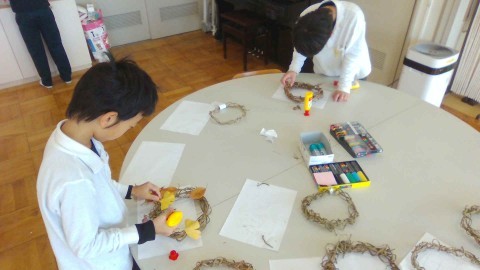 秋に収穫したサツマイモのつるをつかってリングを作っていました。今日はそれを飾りつけしています。完成したらおうちに飾ってほしいですね!!