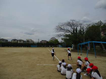 運動場から「リズムなわとび」の音楽が聞こえてきました。5年生が運動場で体育をしていました。ウォーミングアップとして縄跳びを跳んだ後、今日は50メートル走の練習をしました。ゴールまで一生懸命に走ります。「がんばれ!」というクラスの友だちの応援も頼もしいです。