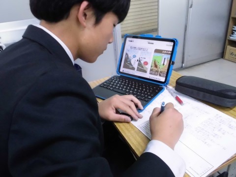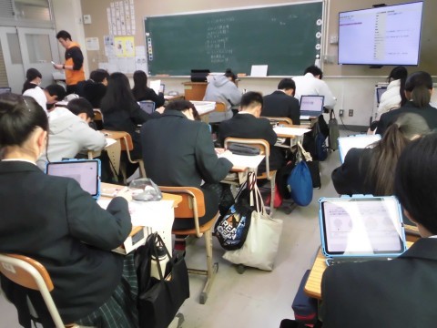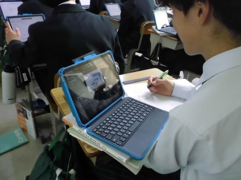 2年4組の理科の様子です。自然災害のメカニズムや対策などについてのレポートを作成していました。