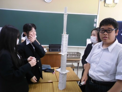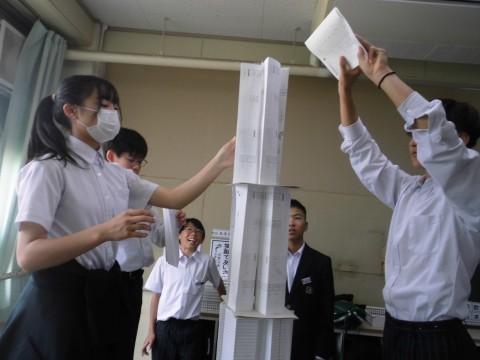 2年生では,紙を使用し,のりやはさみ等を使わずに制限時間にどれだけ高いタワーを作れるか勝負をしました。