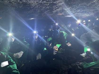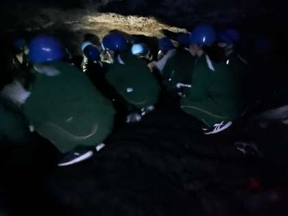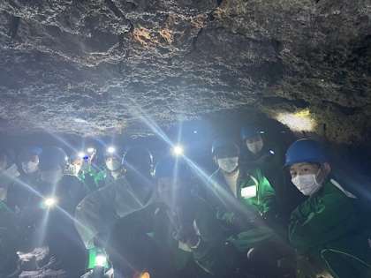 2つ目の洞窟は、しゃがんで移動しないと大変でした。150個ある洞窟の中の2つを探検しました。外は曇っていますが、富士山が薄らと見えます。