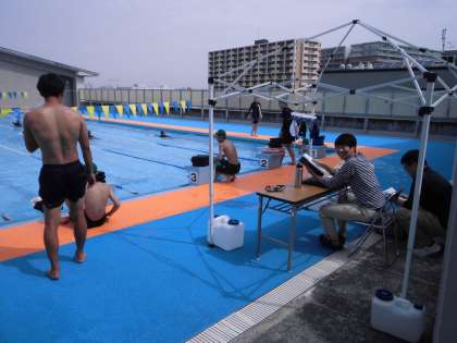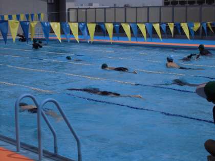 写真は、足にビート板を挟んで上半身のみで泳ぐ練習の様子です。