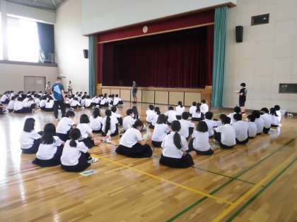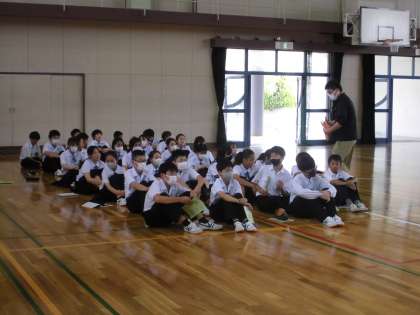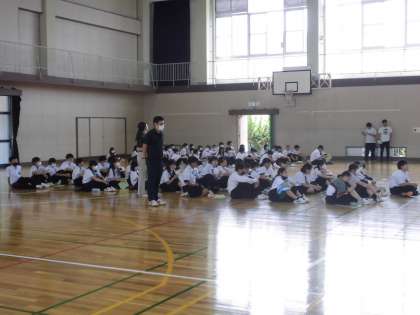 明日の校外学習に向け、1年生は5限目に体育館で前日指導を行いました。