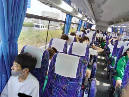 1組のバス内です。CDも流れてのんびりタイムです。ときおりプッと笑える話も聞こえてきます。