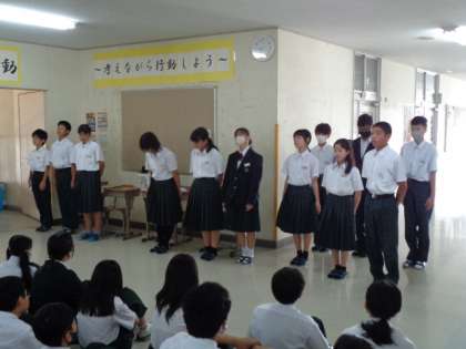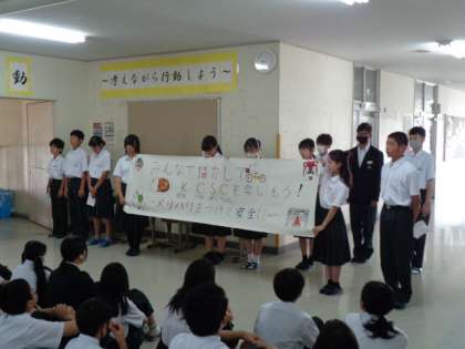 本日の定例集会では学級代表から校外学習のスローガン発表がありました。