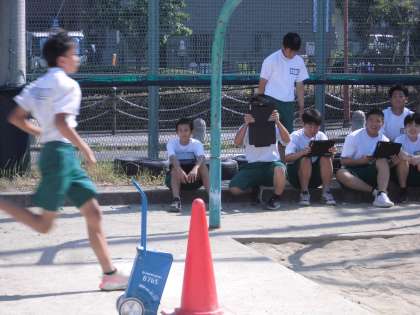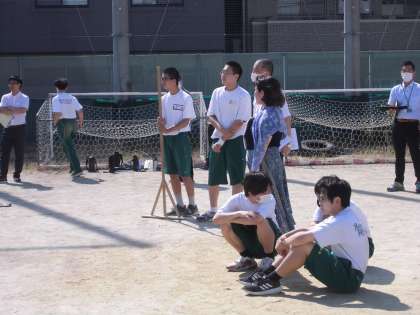走り幅跳びについて、動画で撮影しながら記録をとっていました。
