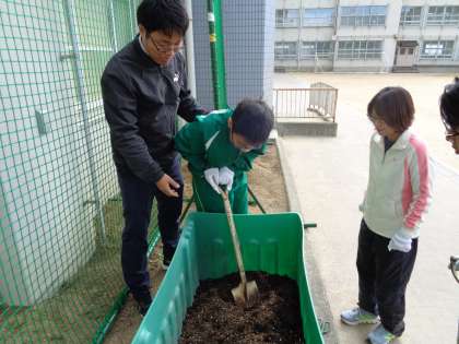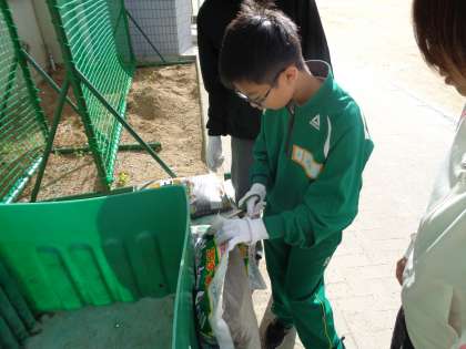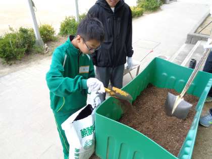 コンテナに土、腐葉土、鶏糞、肥料を入れて栽培用の土をつくりました。