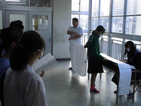本日3年1・2・3・4組の授業では、ソーラン節の実技テストをしました(こちらは1・2組の様子になります)。動画で撮影していたのですが、みんな本番と同じくらいのやる気で、思い切って演技を披露してくれました!