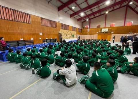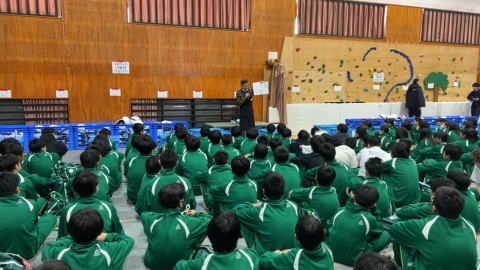 昼食が終わり、スキーウェアの説明を受けている様子です。