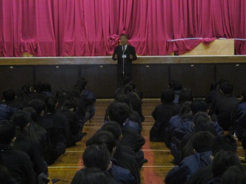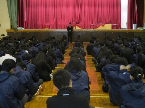 剣道部、バレー部などの表彰を行い、冬休みの過ごし方に関する注意を行いました。