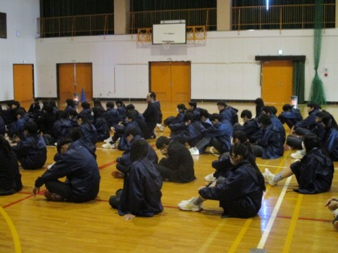 3年生の学年集会は3限めに行いました。受験をマラソンに例え、