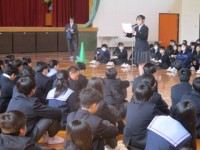 学校給食が終わり、配膳員の方にお礼の色紙を渡していました。